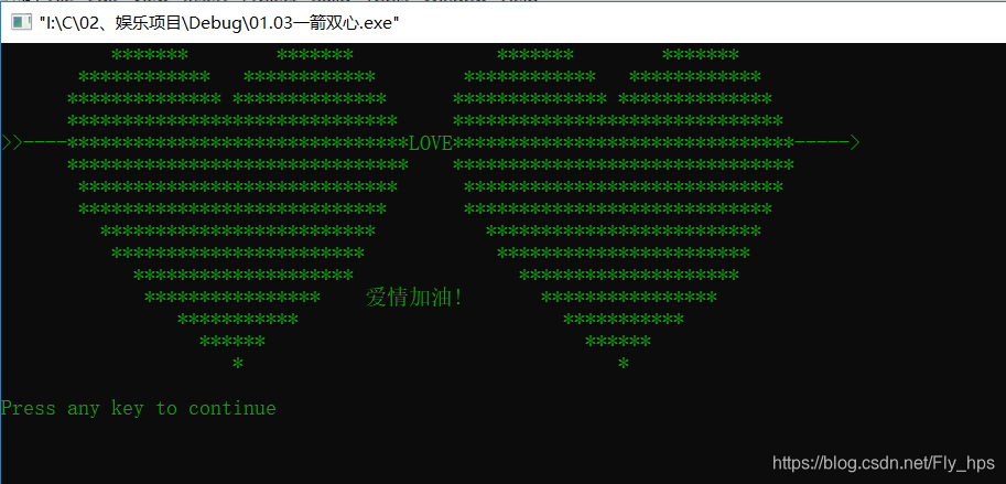 #include#include #define I 8#define R 150int main() {int i,j,e; int a; int t1; for(i=1,a=I;i<=I/2;i++,a--){ t1=6; while(t1--)printf(" "); for(j=(int) ( I-sqrt(I*I-(a-i)*(a-i)) );j>0;j--) printf(" "); for(e=1;e<=2*sqrt(I*I-(a-i)*(a-i));e++) printf("*"); for(j=(int) ( 2*( I-sqrt(I*I-(a-i)*(a-i)) ) );j>0;j--) printf(" "); for(e=1;e<=2*sqrt(I*I-(a-i)*(a-i));e++) printf("*"); for(j=(int) ( I-sqrt(I*I-(a-i)*(a-i)) );j>0;j--) printf(" "); t1= (int) ( I-sqrt(I*I-(a-i)*(a-i)) ) ; t1= 2*t1; t1+=(int) ( 2*sqrt(I*I-(a-i)*(a-i)) ); t1=20-t1; while(t1--) printf(" "); for(j=(int) ( I-sqrt(I*I-(a-i)*(a-i)) );j>0;j--) printf(" "); for(e=1;e<=2*sqrt(I*I-(a-i)*(a-i));e++) printf("*"); for(j=(int) ( 2*( I-sqrt(I*I-(a-i)*(a-i)) ) );j>0;j--) printf(" "); for(e=1;e<=2*sqrt(I*I-(a-i)*(a-i));e++) printf("*"); for(j=(int) ( I-sqrt(I*I-(a-i)*(a-i)) );j>0;j--) printf(" "); printf("\n"); } for(i=1;i<=R/2;i++){ if(i%2||i%3)continue; t1=6; if(i==6)printf(">>----"); else while(t1--)printf(" "); for(j=(int) ( R-sqrt(R*R-i*i) );j>0;j--) printf(" "); for(e=1;e<=2*( sqrt(R*R-i*i) - (R-2*I) );e++) printf("*"); for(j=(int) ( R-sqrt(R*R-i*i) );j>0;j--) printf(" "); t1= (int)( R-sqrt(R*R-i*i) ); t1=2*t1; t1+= (int)(2*( sqrt(R*R-i*i) - (R-2*I) )); t1=35-t1; if(i==6){printf("LOVE");} else if(i==48){printf("\b\b\b爱情加油!");} else while(t1--) printf(" "); for(j=(int) ( R-sqrt(R*R-i*i) );j>0;j--) printf(" "); for(e=1;e<=2*( sqrt(R*R-i*i) - (R-2*I) );e++) printf("*"); for(j=(int) ( R-sqrt(R*R-i*i) );j>0;j--) printf(" "); if(i==6)printf("----->"); printf("\n"); } return 0; }